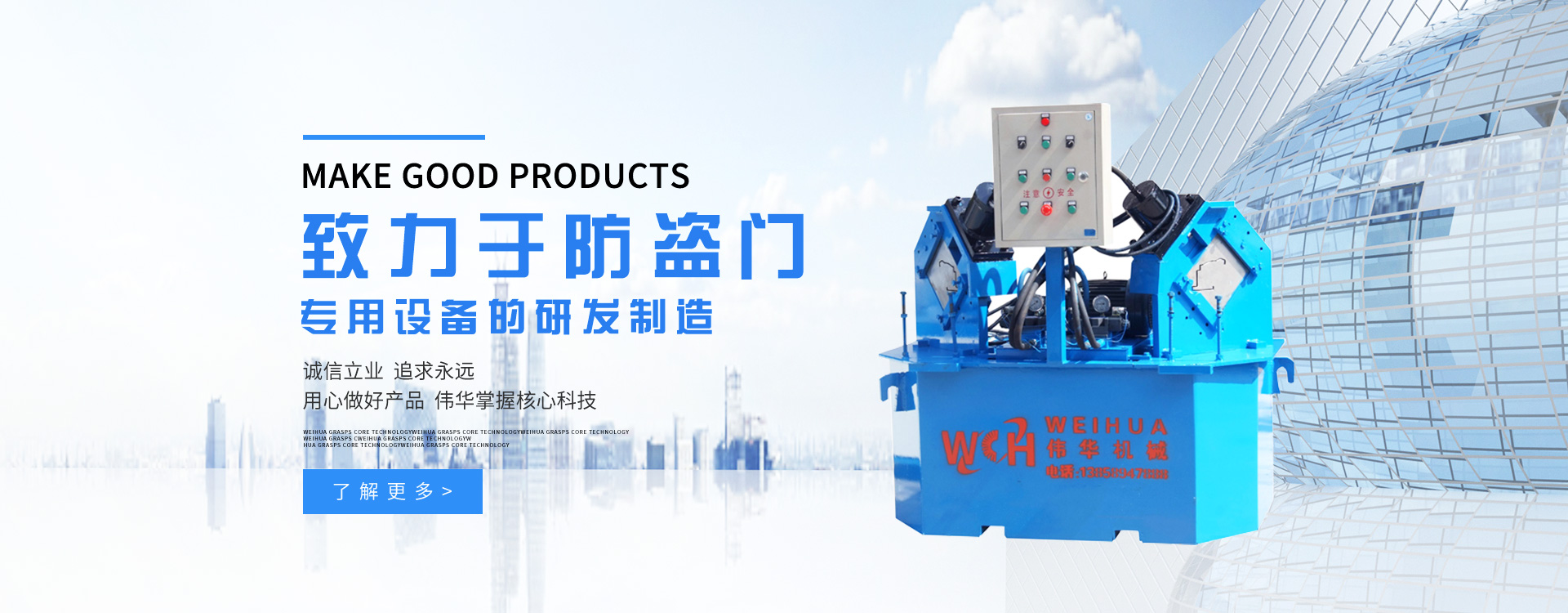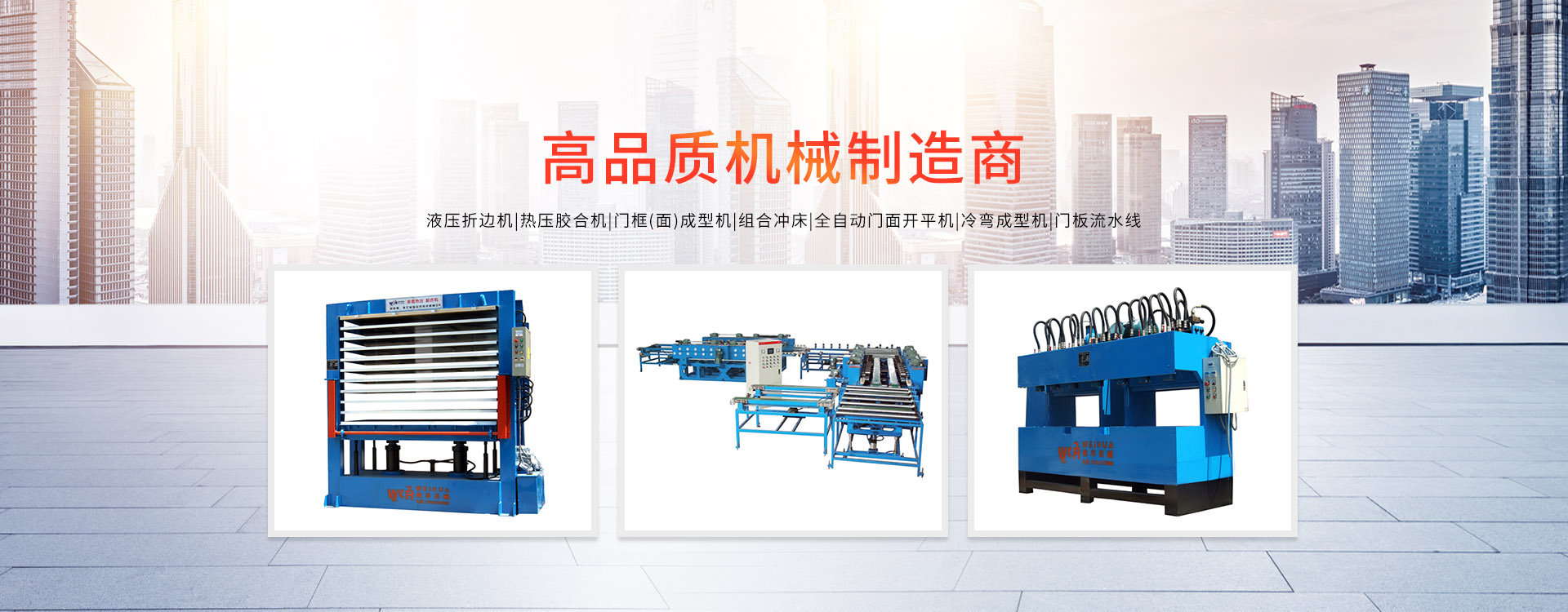 更多>溫州偉華機(jī)械制造有限公司地處浙江溫州瑞安市塘下工業(yè)區(qū),創(chuàng)建于2009年,數(shù)年來全心致力于防盜門專用設(shè)備的研發(fā)制造,主營產(chǎn)品有:門面成型機(jī)、門框成型機(jī)、熱壓膠合機(jī)、組合沖床、液壓折邊機(jī)、雙頭沖床、門面開平機(jī)。現(xiàn)已具備獨特的管理模式和產(chǎn)品開發(fā)能力,歷經(jīng)多年的努力,現(xiàn)已發(fā)展成為國內(nèi)最具影響力的機(jī)械設(shè)備企業(yè)之一。